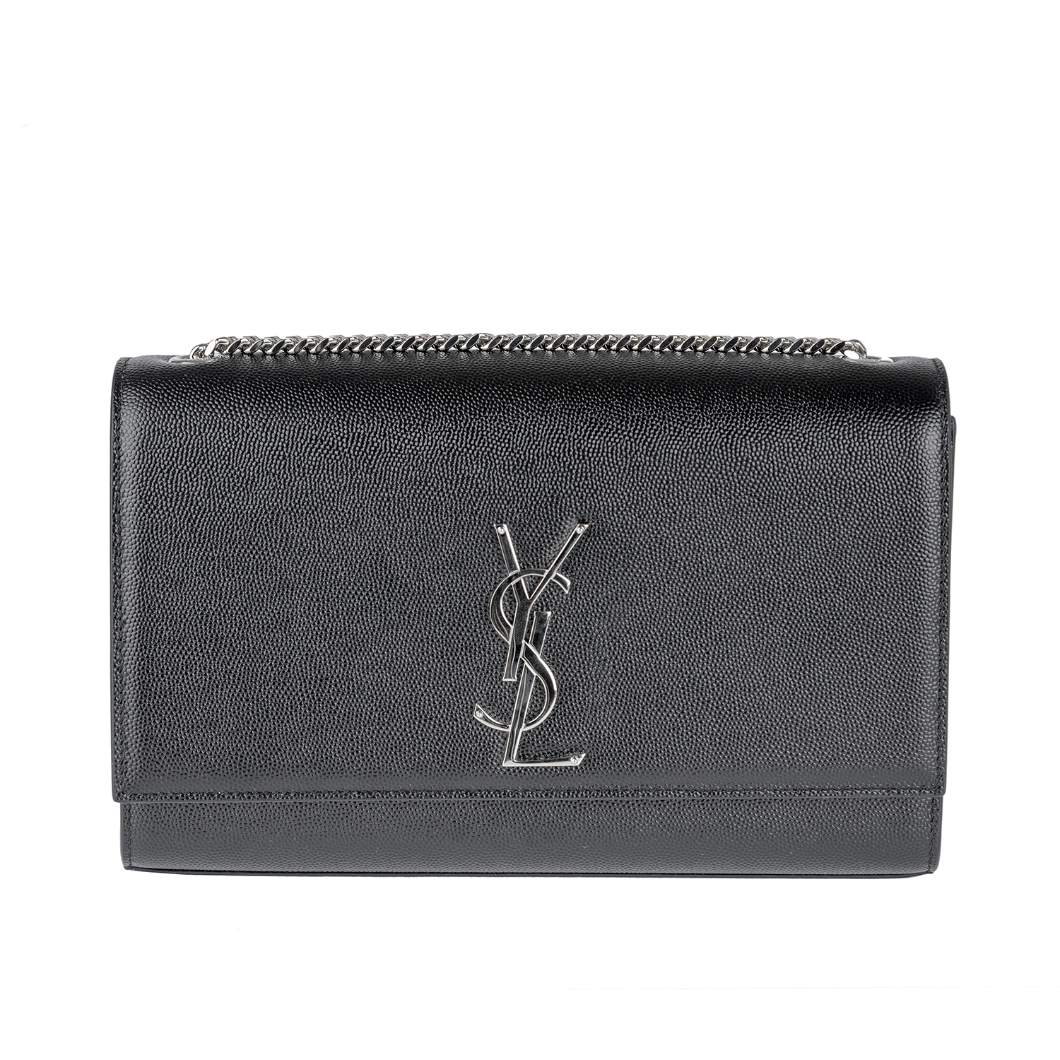 Sac à louer Yves Saint Laurent Satchel Kate moyen en cuir de veau texturé. Fabriqué de manière classique avec une chaîne gourmette tricotée et un logo Yves Saint Laurent en métal tressé, il est un sac de luxe irrésistible. La fermeture est en argent avec un bouton magnétique. L' intérieur est en tissu avec une poche fendue interne. Ce sac monogramme classique porté à l' épaule a un volume parfait même pendant la journée.